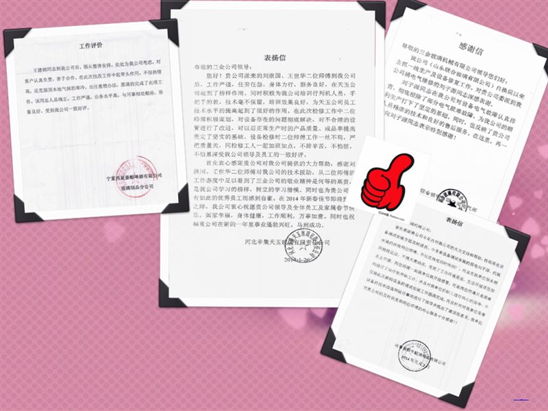 近日,辛集天玉、吐魯番毓牛、寧夏西夏、山東聯(lián)合等客戶單位紛紛發(fā)來感謝信和表揚(yáng)信,對三金公司劉繼國、王世華、劉子源、孫俊、王建鋼等售后服務(wù)人員的精湛技術(shù)、良好的售后服務(wù)和認(rèn)真負(fù)責(zé)的敬業(yè)精神表示贊揚(yáng)肯定,這是對三金品牌和服務(wù)的認(rèn)可。客戶的肯定是三金前進(jìn)的最大動(dòng)力,“精益求精打造三金品牌,全心全意服務(wù)用戶”將是我們不竭的追求。